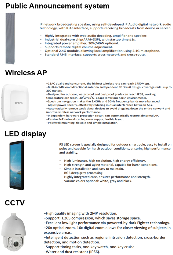 Smart poles are equipped with 4G/5G small cells and Wi-Fi access points to improve mobile network coverage and internet speed in urban areas. - IoT (Internet of Things) Support
